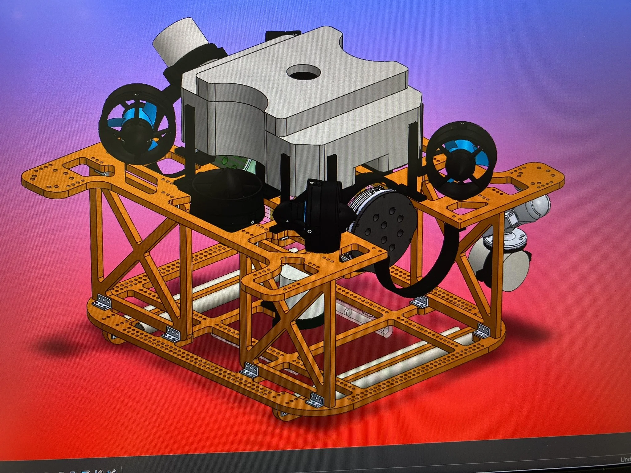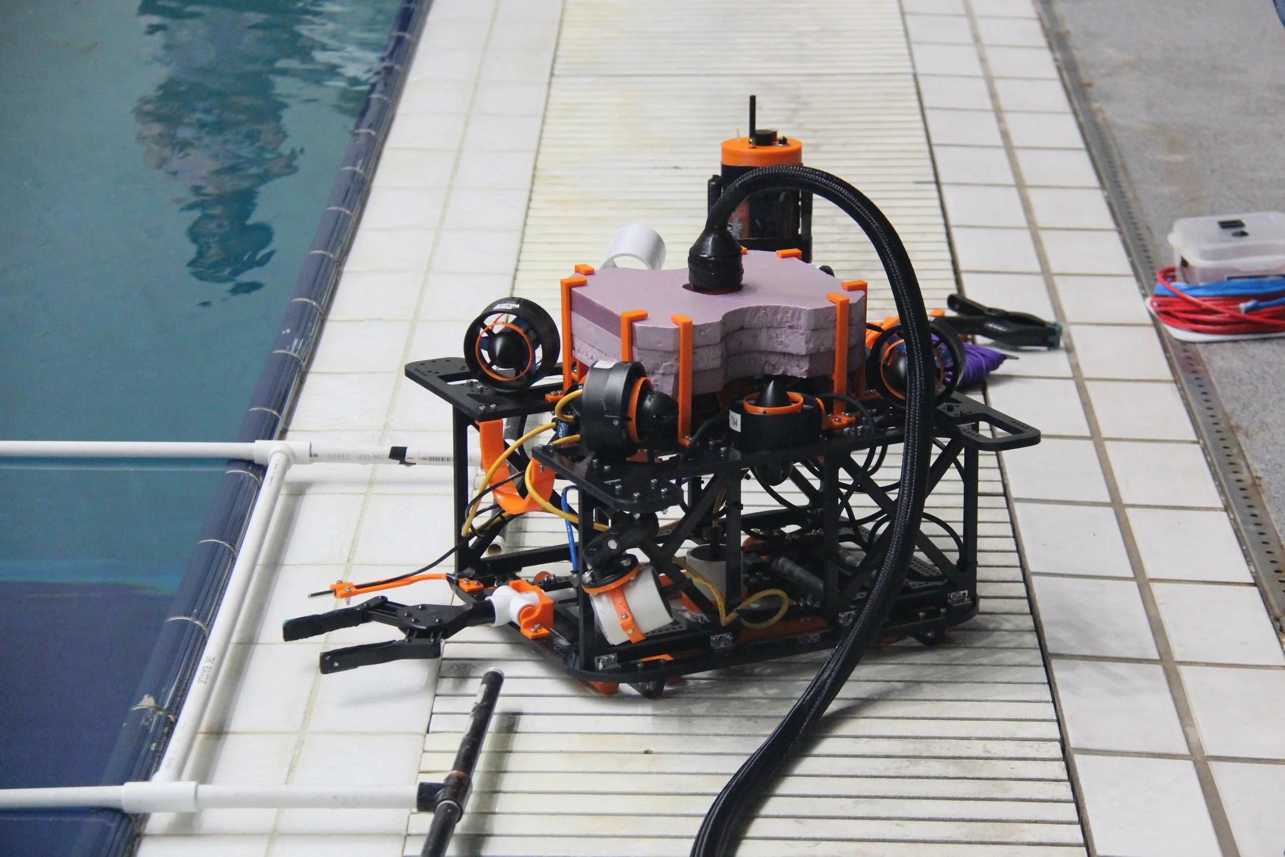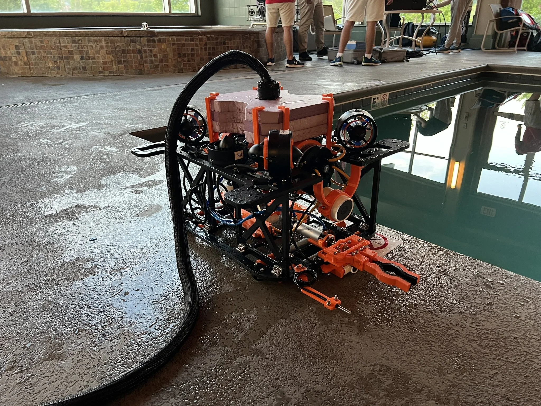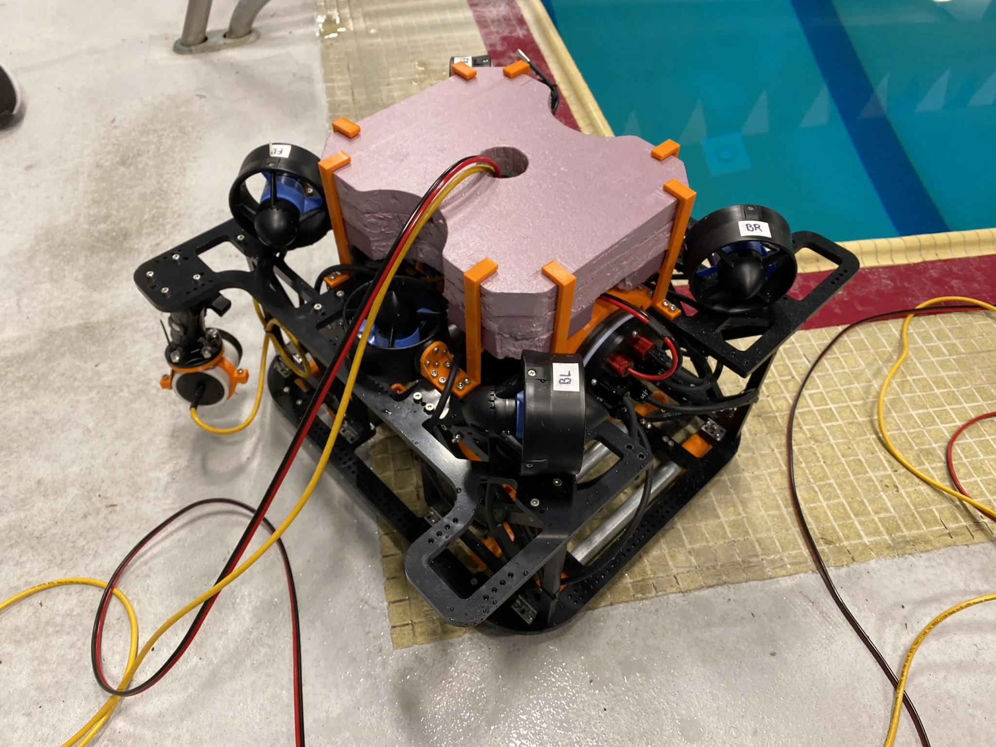Built over 850 hours by a five-member student team, Spooky Jobs combined precision engineering with a passion for ocean conservation. The ROV featured six Blue Robotics T200 thrusters for five degrees of freedom, two waterproof IP cameras for adjustable views, and a pneumatic claw for underwater tasks such as coral transplantation and debris retrieval. Its custom-machined ABS frame, buoyant foam, and non-toxic bismuth and steel ballast ensured stability and control. Safety was a top priority, with 3D-printed thruster guards, a humidity sensor for automatic shutdowns, and smooth, sanded frame edges.