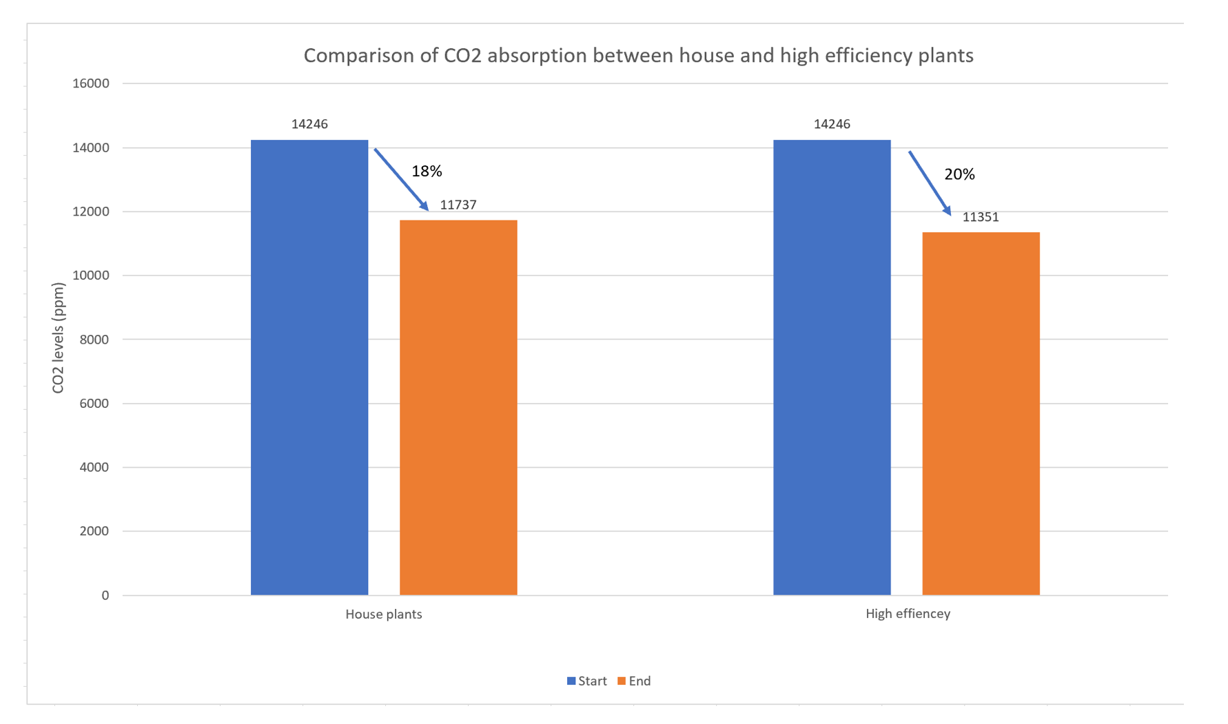 High efficiency plants reduced the CO2 by 20% over an 8 hour period. House plants reduced the CO2 by 18% in 9 hours. This may lead us to believe that high efficiency and more efficient in absorbing CO2.